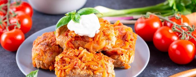 Sekoita kaikki keskenään niin, että seos tarttuu hyvin yhteen. Jos seos hajoaa, vatkaa joukkoon yksi ylimääräinen muna. Muotoile täytetyt kaalit märin käsin, kasta jauhoihin ja paista öljyssä, kunnes ne ovat ruskistuneet molemmin puolin. Laita ne paksupohjaiseen kattilaan. Sekoita tomaattimurska ja smetana ja lisää kuumaa vettä, kunnes kastike muistuttaa nestemäistä kefiiriä. Mausta se mausteilla ja kaada se täytetyn kaalin päälle. Jos kastike ei peitä niitä 90-prosenttisesti, lisää vettä.