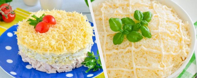 Tässä ruokalajissa ainekset hienonnetaan, asetetaan erillisiin kerroksiin ja voidellaan majoneesilla. Lihan ja hedelmien yhdistämisen ystävät voivat lisätä reseptiin ananasta, maissia tai viinirypäleitä.