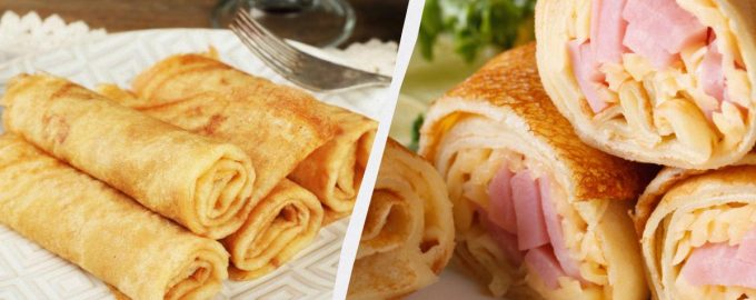 Nämä pannukakut ovat niin herkullisia, että tästä reseptistä tulee varmasti suosikkisi. Pannukakkuja kinkulla ja juustolla / kollaasi My, kuva depositphotos.